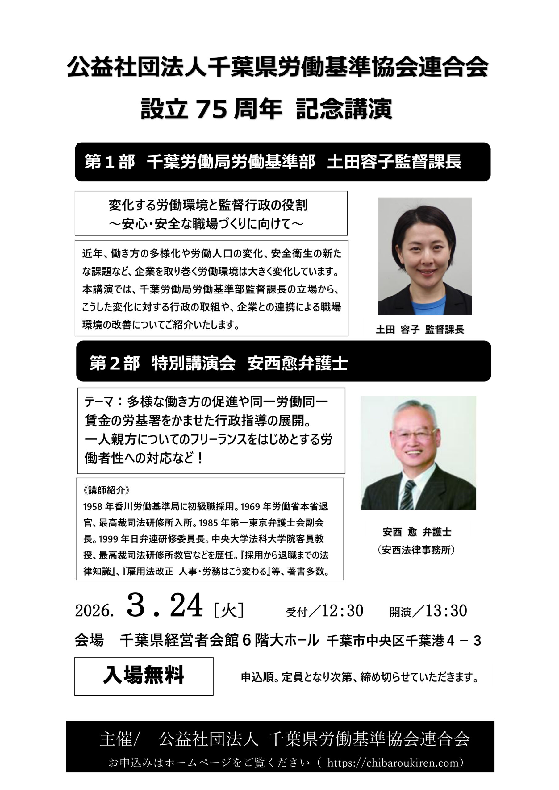 『(公社) 千葉県労働基準協会連合会 設立75周年 記念講演』の開催について 参加申込書は下記「申込書」をクリックしてダウンロード下さい。 →申込書← みなさまのご来場を心よりお待ちしております。 【千葉労働局】千葉県最低賃金は64円引き上げて1,140円に。限定列車やバスも運行します(青字クリックで千葉労働局HPを閲覧できます)